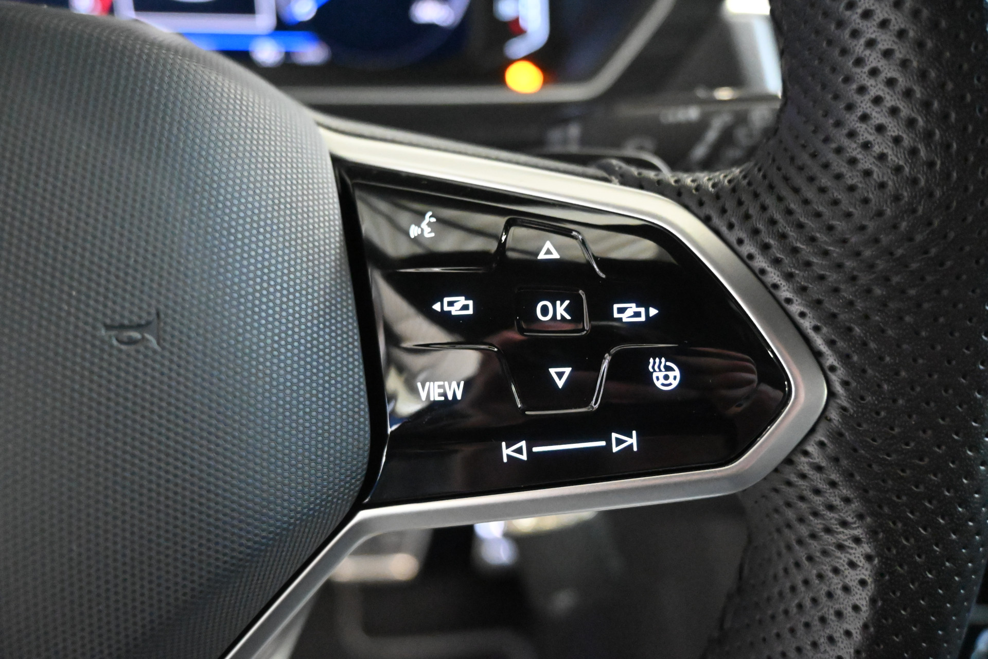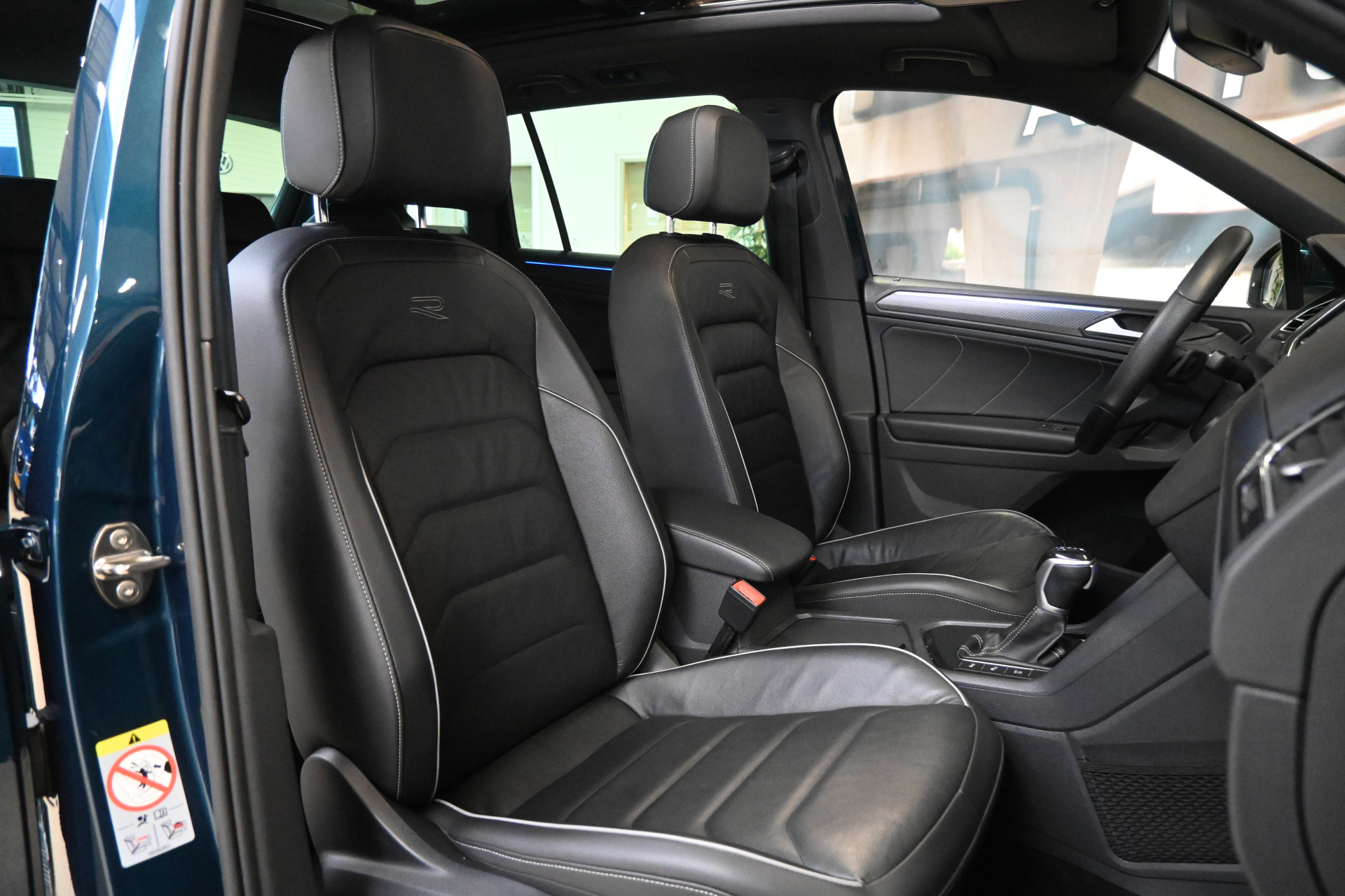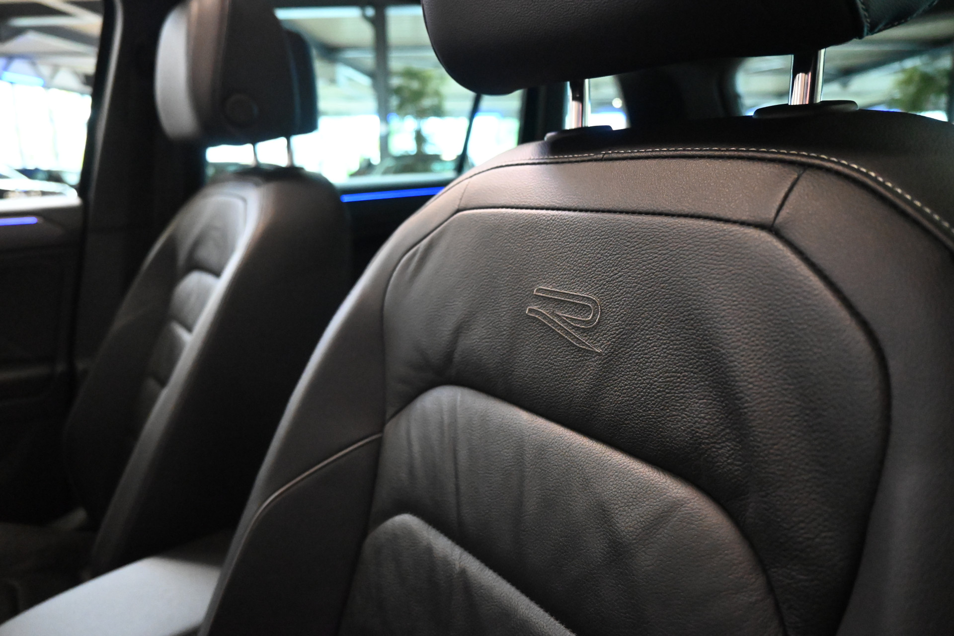 De R-Line sportstoelen zijn volledig met leder bekleed, beide stoelen en het stuurwiel zijn verwarmbaar.