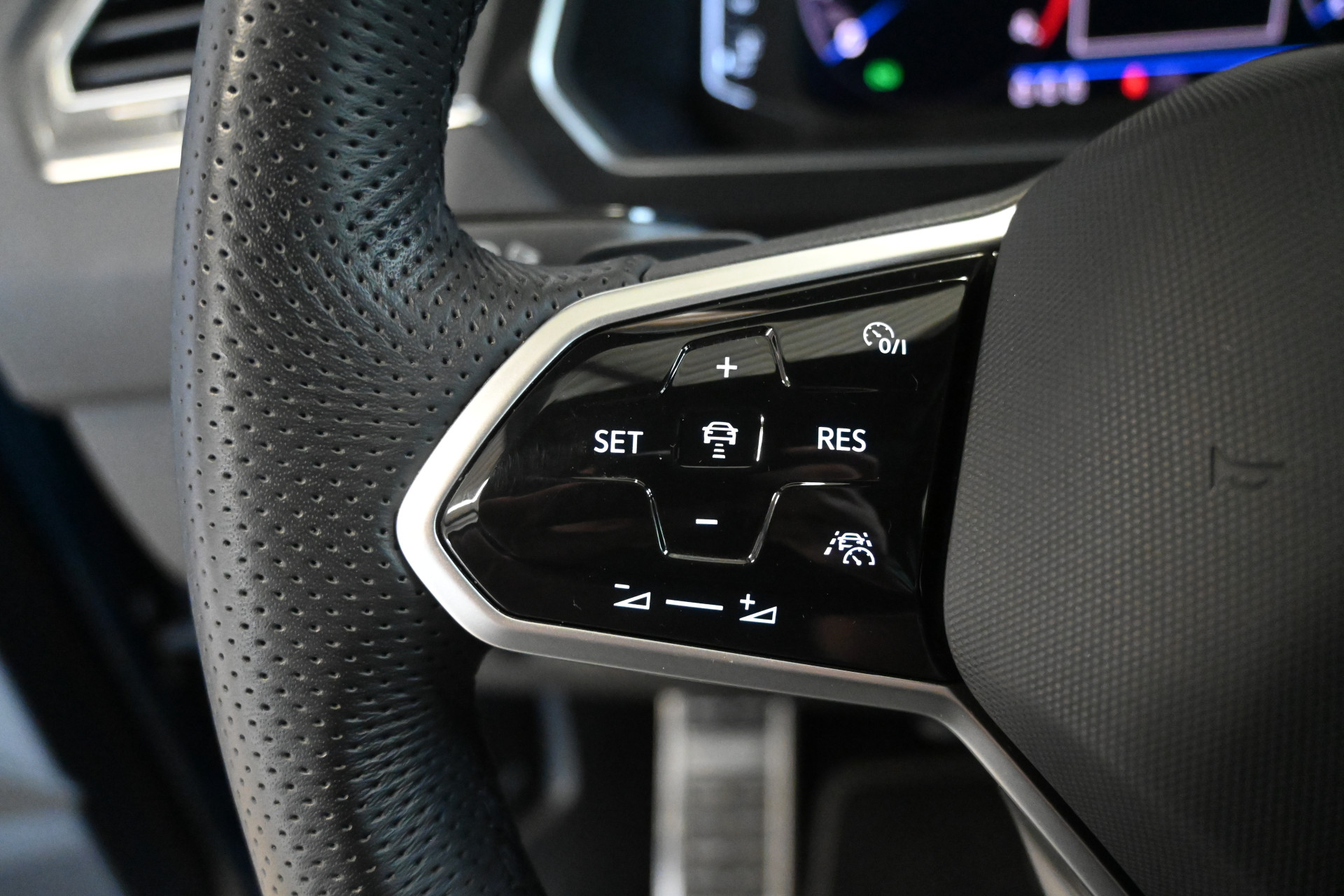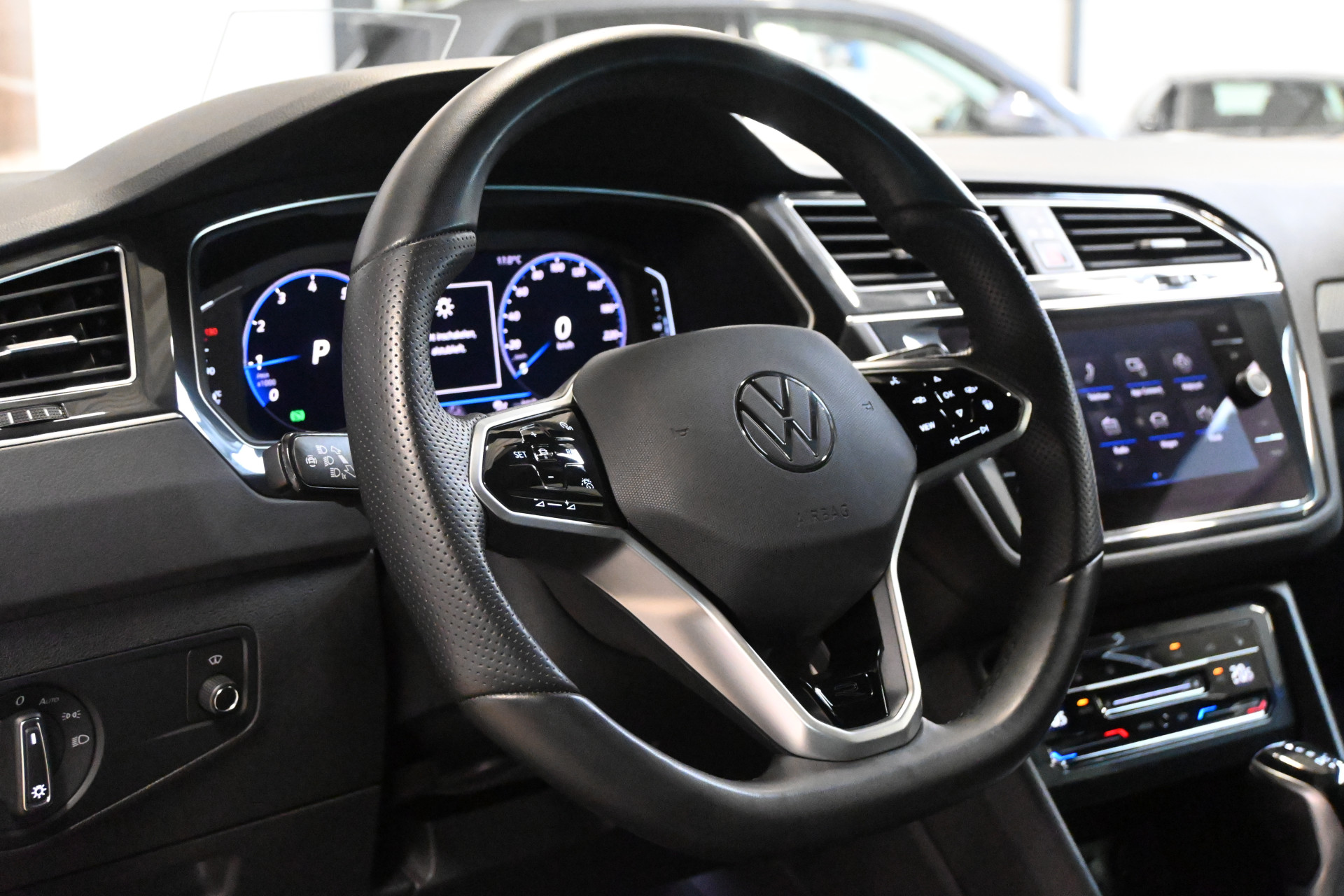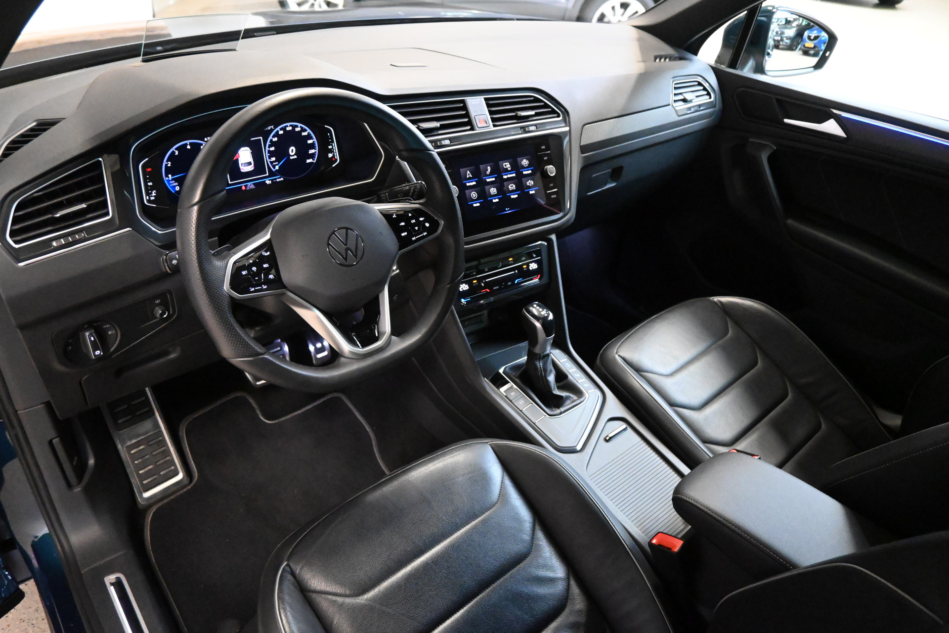 De R-Line sportstoelen zijn volledig met leder bekleed, beide stoelen en het stuurwiel zijn verwarmbaar.