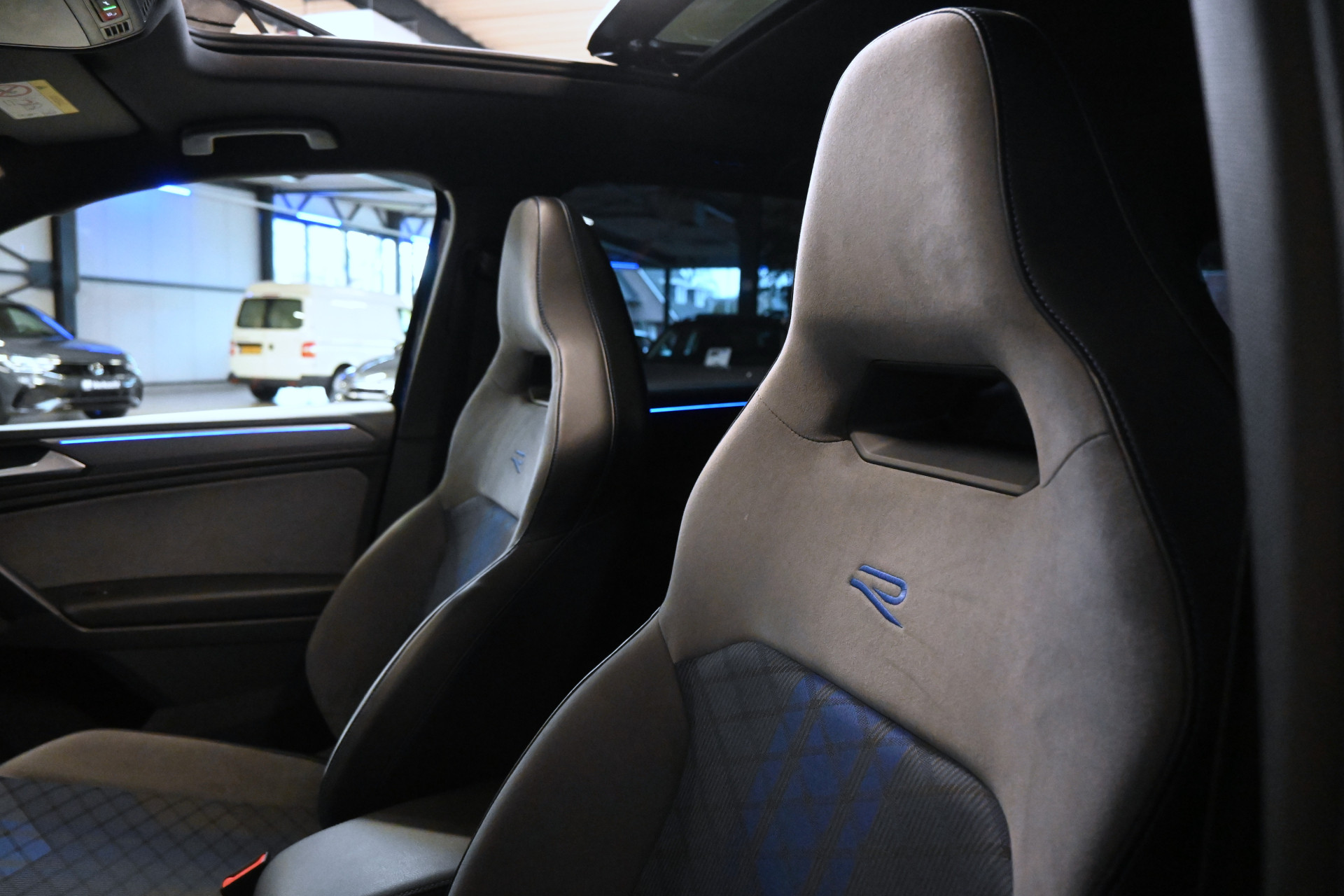De R sportstoelen zijn bekleed met een mix van alcantara, leder en stof. Beide voorstoelen en het stuurwiel zijn verwarmbaar.