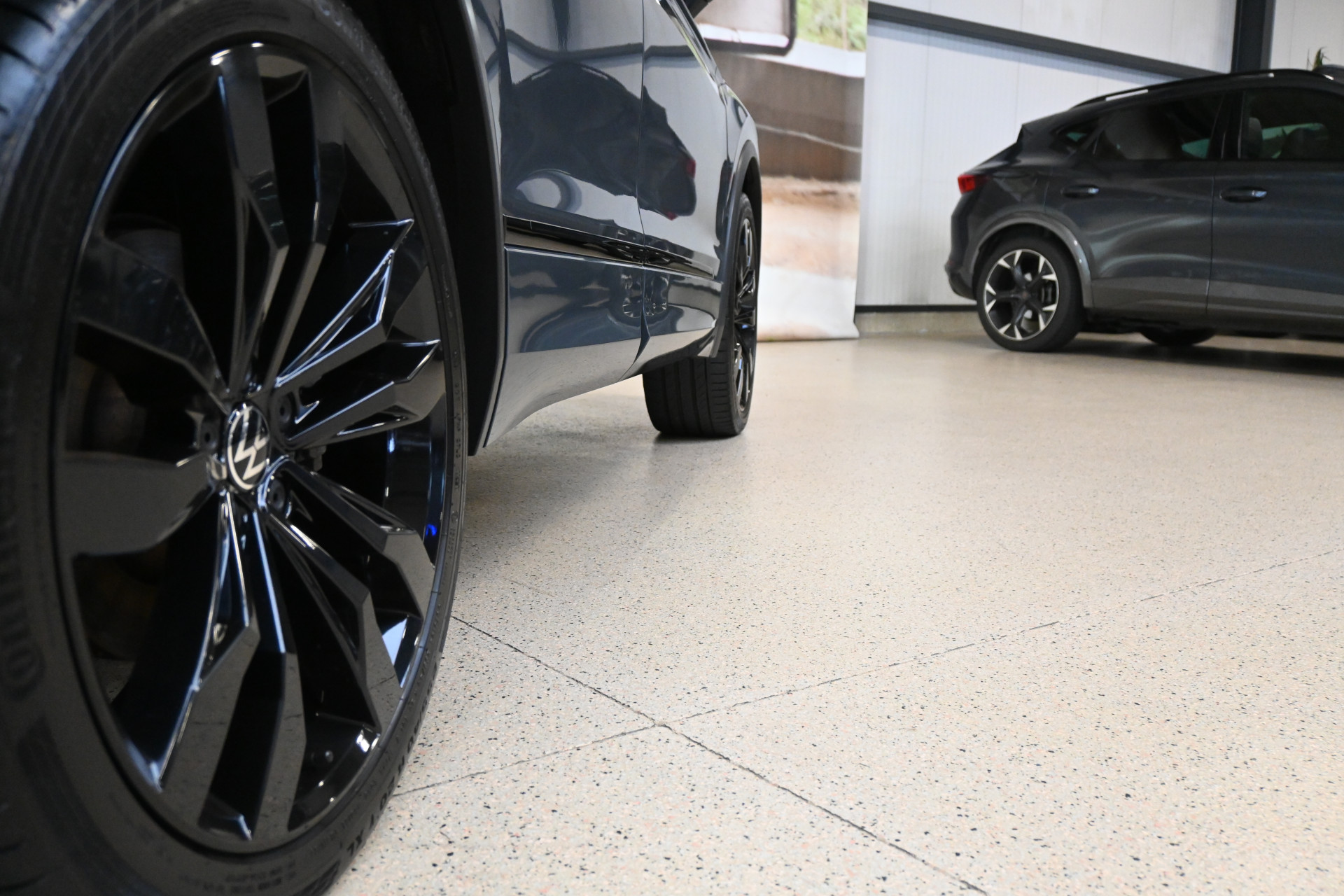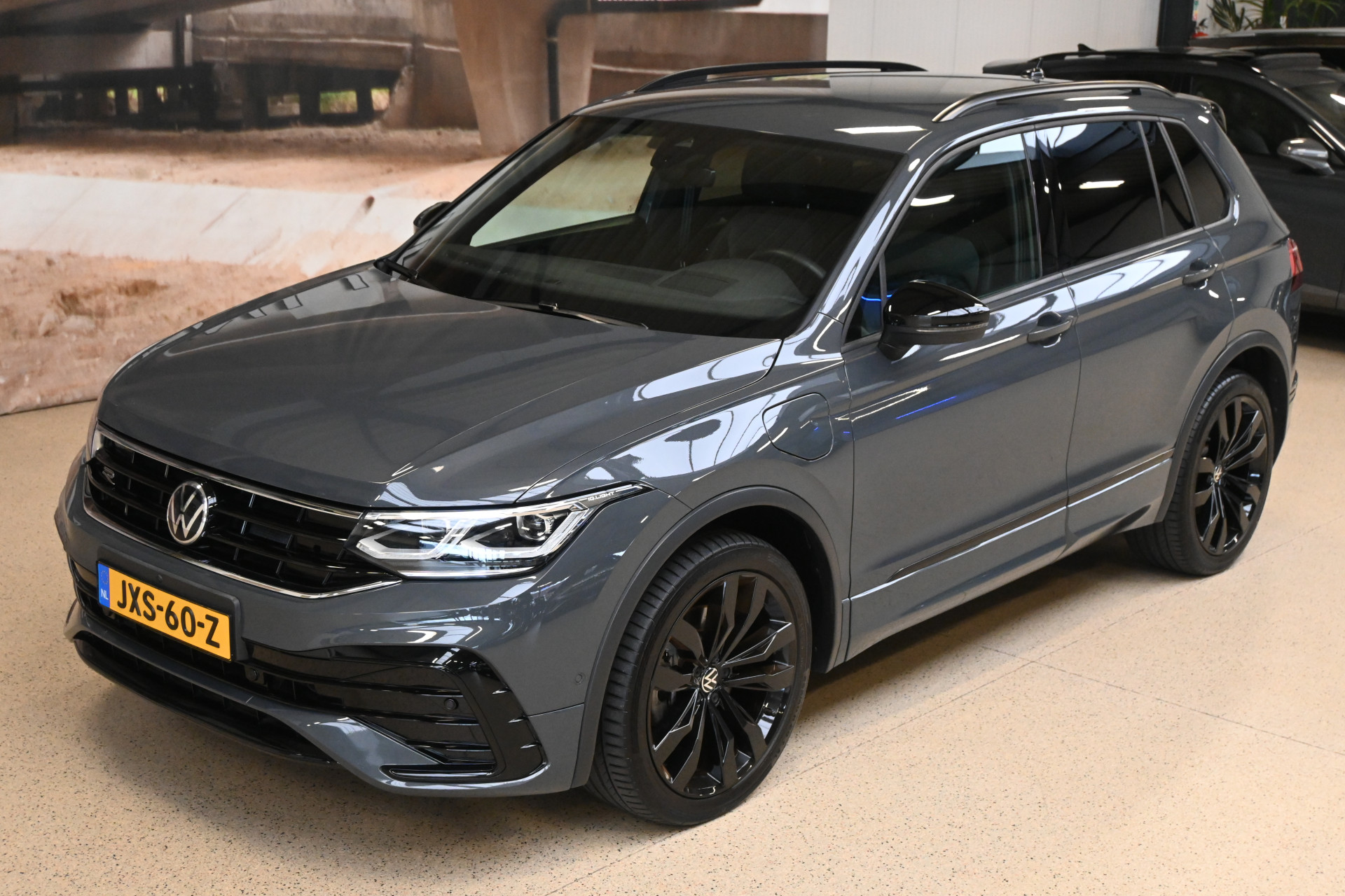 Deze Tiguan is gespoten in de kleur Dolphin Grau een donkergrijze metallic lak en voorzien van het ''Black pack''!